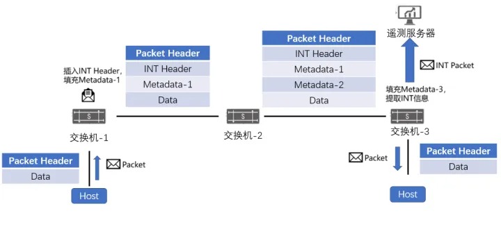 INT 技术的实现由交换机底层硬件支持,在数据平面芯片内部进行采集,通过在业务数据包内嵌入指令,使交换机在转发时动态插入本地的精准遥测数据(如设备ID、队列时延、拥塞状态等),最终由接收端(如服务器或其他网络边缘设备)解析并上报这些信息。