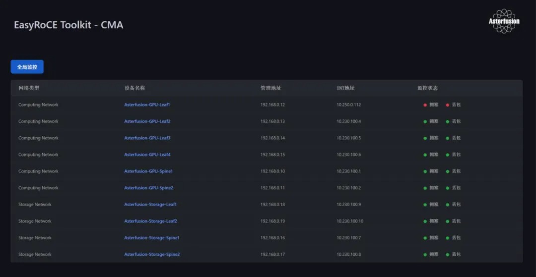 CMA 首页可以通览所有交换机的网络拥塞和丢包状态,默认情况下,CMA在5分钟内收到某个交换机的HDC/BDC报文,监控状态一栏相应状态会显示变红。