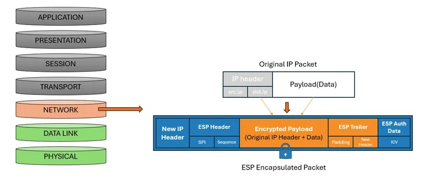 - ESP(Encapsulating Security Payload,封装安全载荷):提供加密、认证和完整性校验 。由于涉及数据载荷加密,这是 VPN 中最耗费性能的部分
