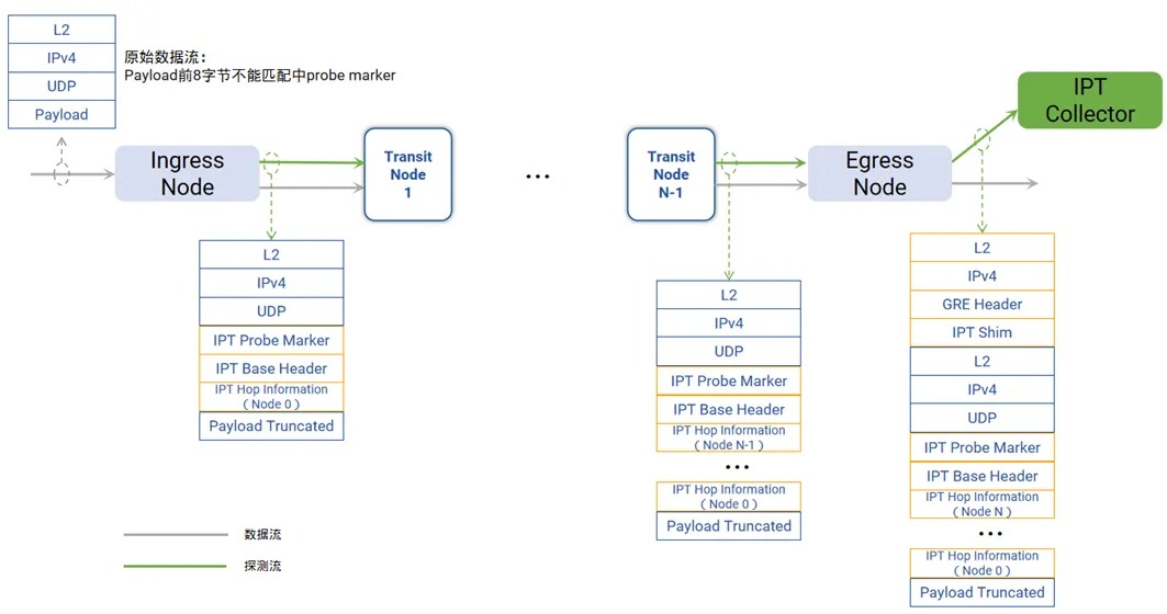 4. 插入标记与头信息:包含 探针标记(Probe Marker) 用于后续节点识别、IPT Base Header(标识版本和跳数等)以及该入口节点的统计信息。