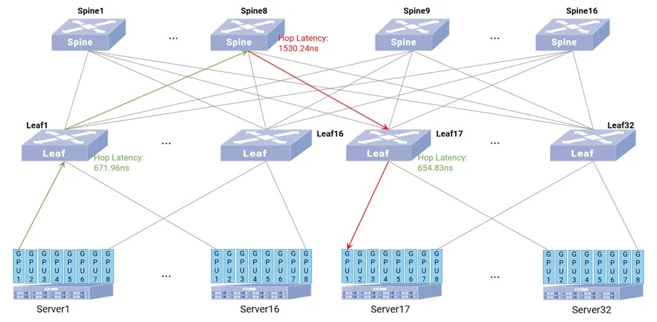 如下图所示,训练过程中,梯度数据需经多台Leaf/Spine交换机转发。IPT通过探测数据包采集各节点转发时延,结合入口到出口的总时延,定位高延迟节点(如某Spine交换机转发时延异常升高),辅助调整流量转发路径,避免因单节点延迟导致整体训练效率下降。