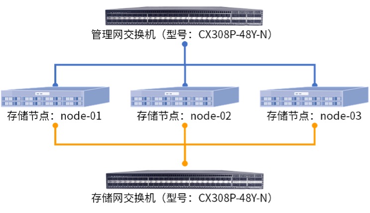 使用25G光纤模块将服务器与管理网、存储网交换机按照图4.2的拓扑连线。对于此次的验证方案,需要两个二层网络,在交换机上电开机后无需其他配置操作,只需要在完成连线后确认各个端口状态为UP且速率协商正常即可。