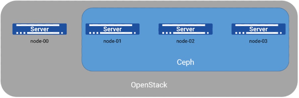 本次实验共使用了4台节点,OpenStack与Ceph已经提前部署完成,为节省资源进行了角色融合。其中,node-01、node-02、node-03为3个节点的N版Ceph存储集群,同时也是OpenStack的计算节点。在部署OpenStack时,考虑到现有3个节点的承载能力,新加入一台节点node-00作为OpenStack的云控节点。