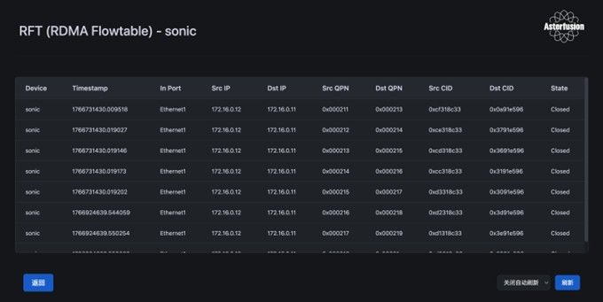 • RFT(RDMA Flow Table):负责收取连接管理(CM)报文并对其解析,构建会话状态机,记录会话生命周期;以上RFT信息通过4791端口向外暴露