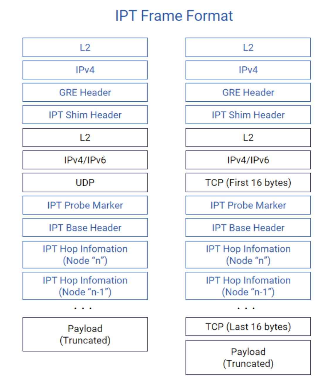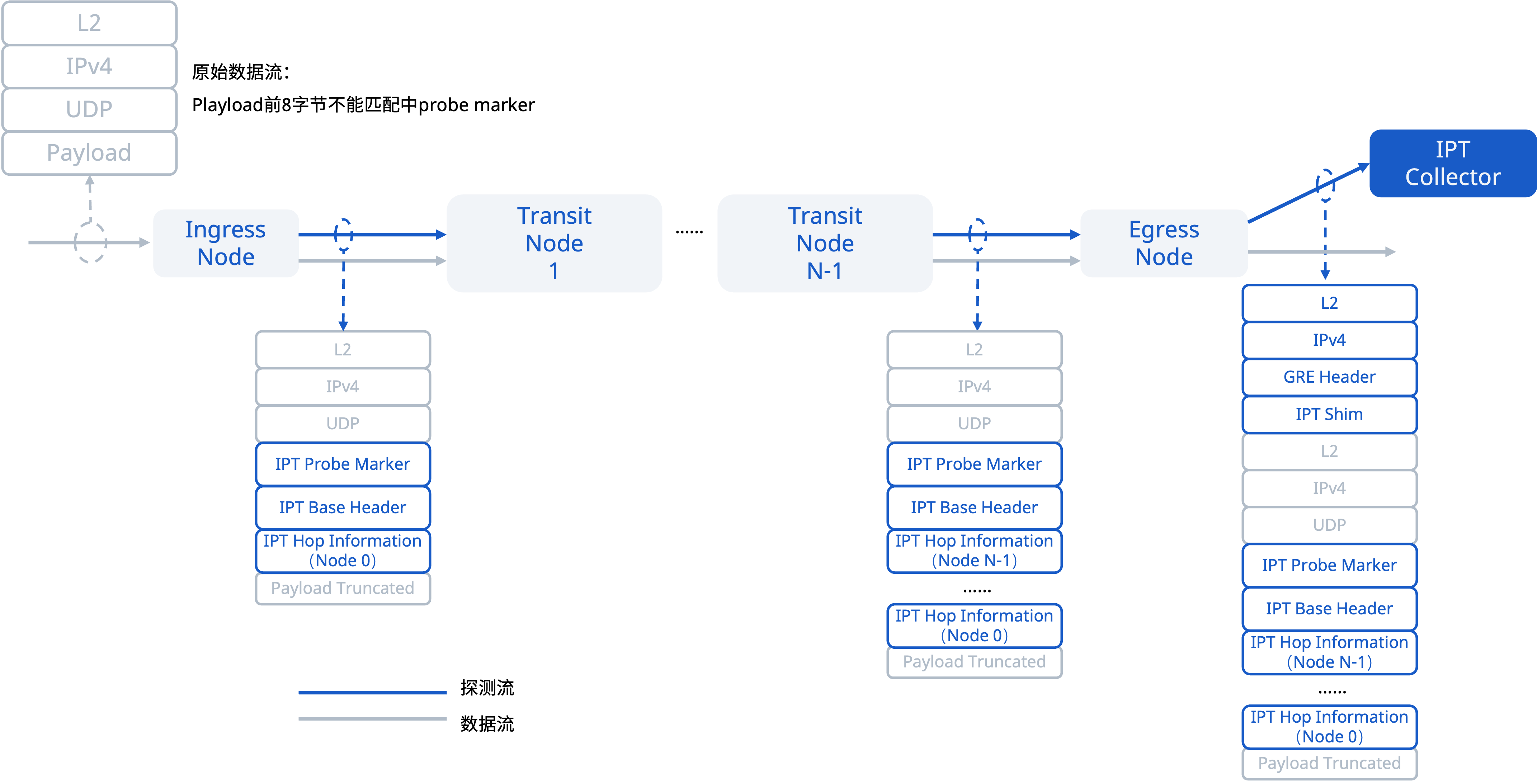 如图,IPT报文由多层头部构成,包含L2/L3封装、GRE头部、IPT Shim头部、探针标记及各节点统计信息等字段。