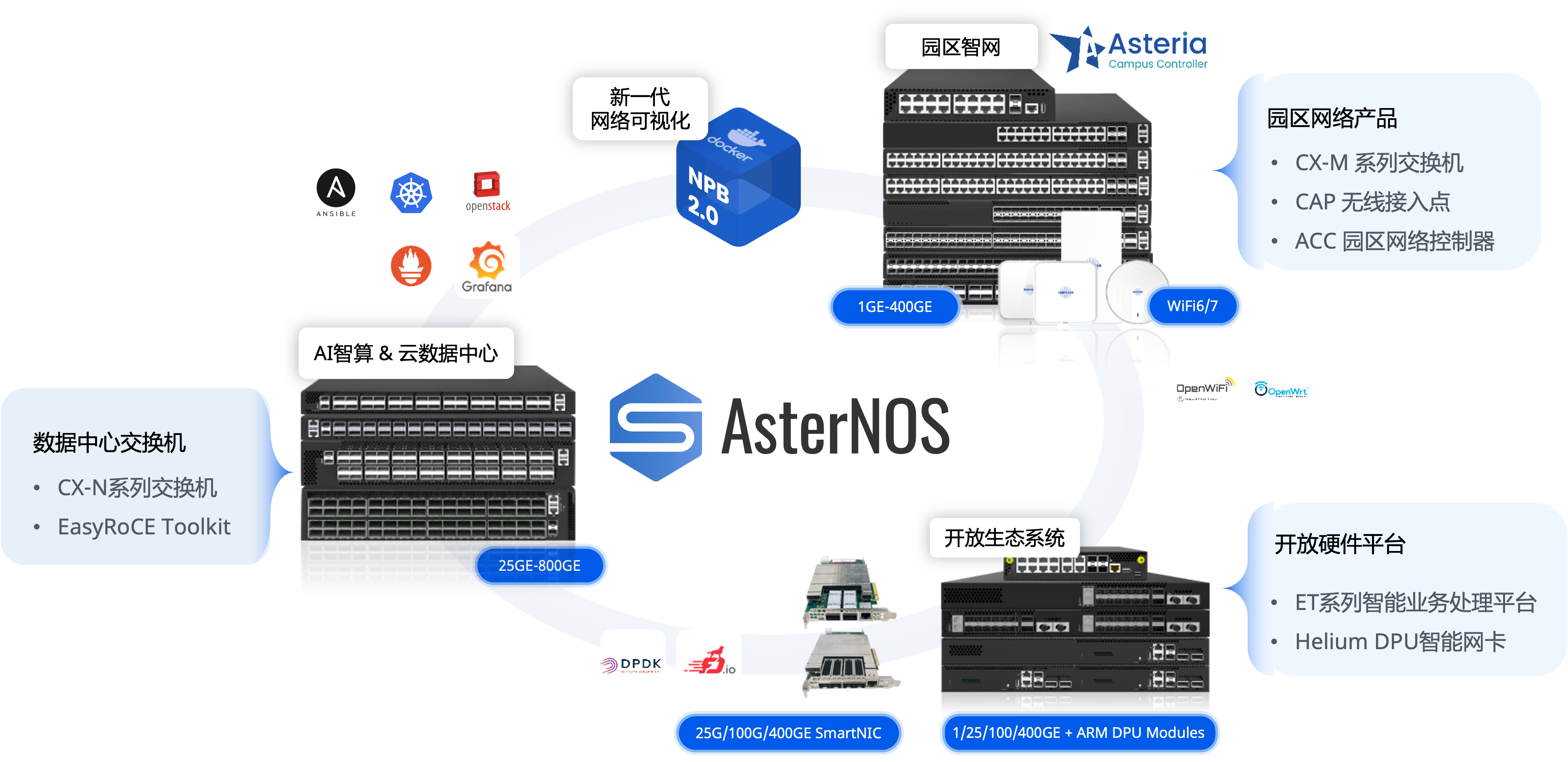 800G 交换机之外,我们还带了一台半宽的开放硬件平台:ET2500。这款设备我们尚未正式在国内市场发布,初步定位的场景是部署在企业出口,作为算网融合开放网关承担从路由器、防火墙到网络流量分析器的全部功能,替代原本用价格不菲的多台专用设备串联而成的出口架构。