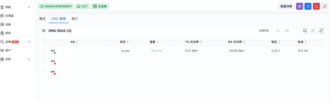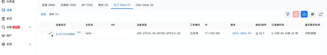 OLT Stick 获取 IP 后会主动向 ACC 控制器发起注册,并建立起持续的心跳与控制通道,周期性上报在线/离线状态、光模块信息、实时与历史光功率、连接历史等,以上都不需要运维人员手动加以配置。