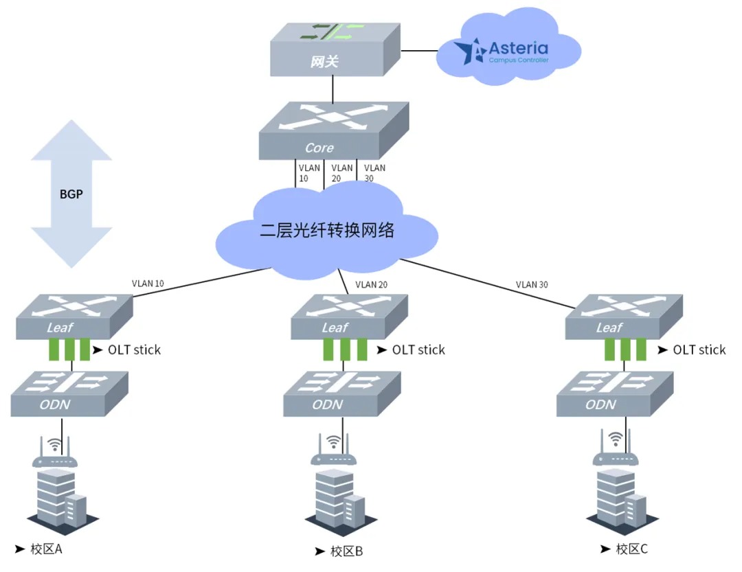 Leaf层交换机的 SFP 端口插入 OLT Stick,将不同业务 VLAN(如 10、20、30)由以太光转换为 PON 光信号,经光纤传输至分光器(ODN)层,最终连接多所分校的AP上,实现高效、可扩展的分校无线网络接入与管理。